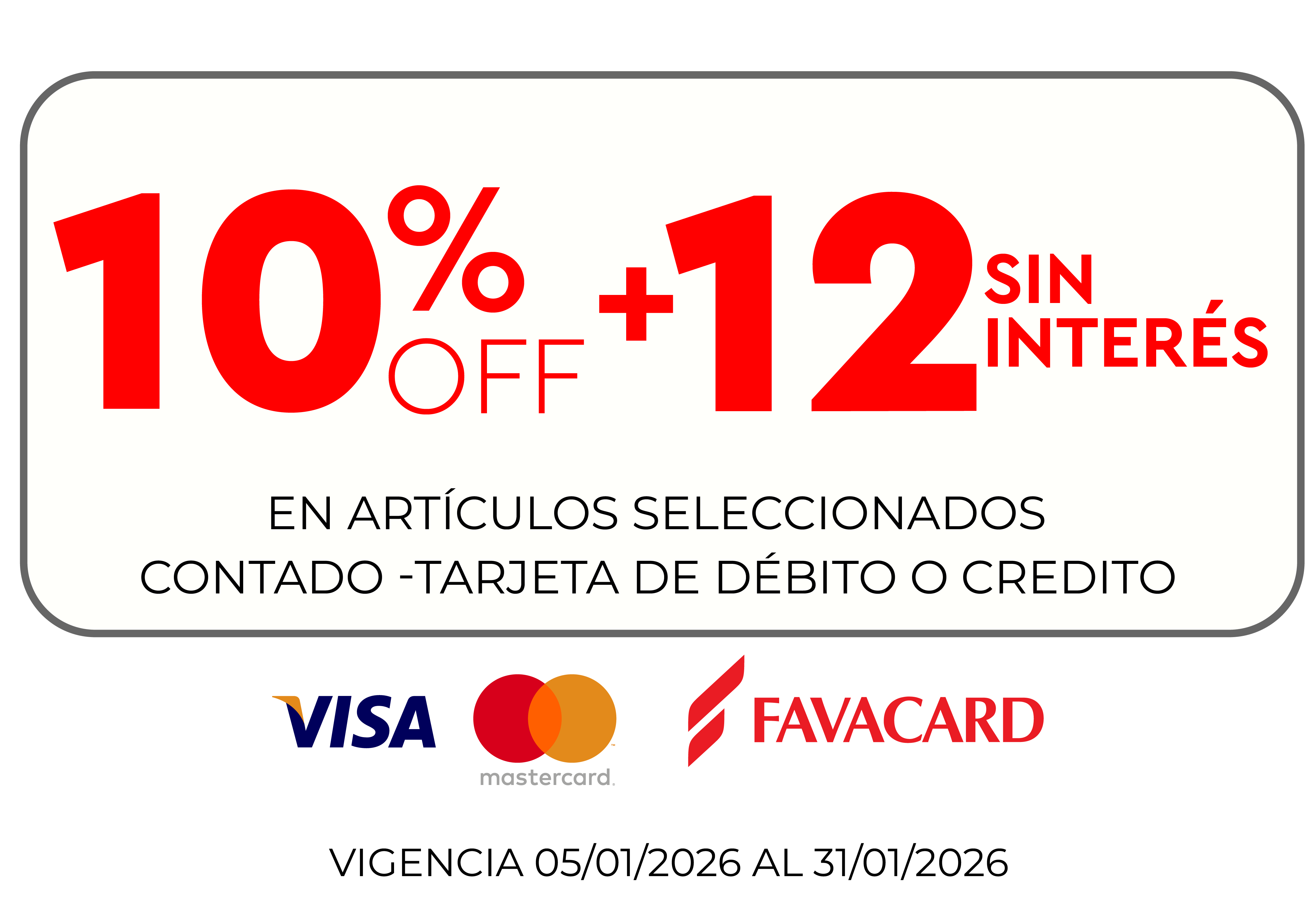 Promoción 10% off + 12 cuotas sin interés: 10% de descuento más 12 cuotas sin interés en artículos seleccionados abonando con tarjeta Favacard, Visa o Mastercard bancarizadas. Vigente desde el 05/01/2026 al 31/01/2026 o hasta agotar stock de 5 un. Promoción sin tope de reintegro. El descuento se aplica sobre el precio de lista. Válido para compras efectuadas en sucursales, venta telefónica y venta web. CFTNA 0,00% (Costo Financiero Total Nominal Anual). CFT 0,00% (Costo Financiero Total). TNA 0,00% (Tasa Nominal Anual). TEA 0,00% (Tasa Efectiva Anual). Fava Hnos Sacif, Cuit 30-50085237-9 - Casa Central: Av.Luro 3247, Mar del Plata Provincia de Buenos Aires- Argentina.