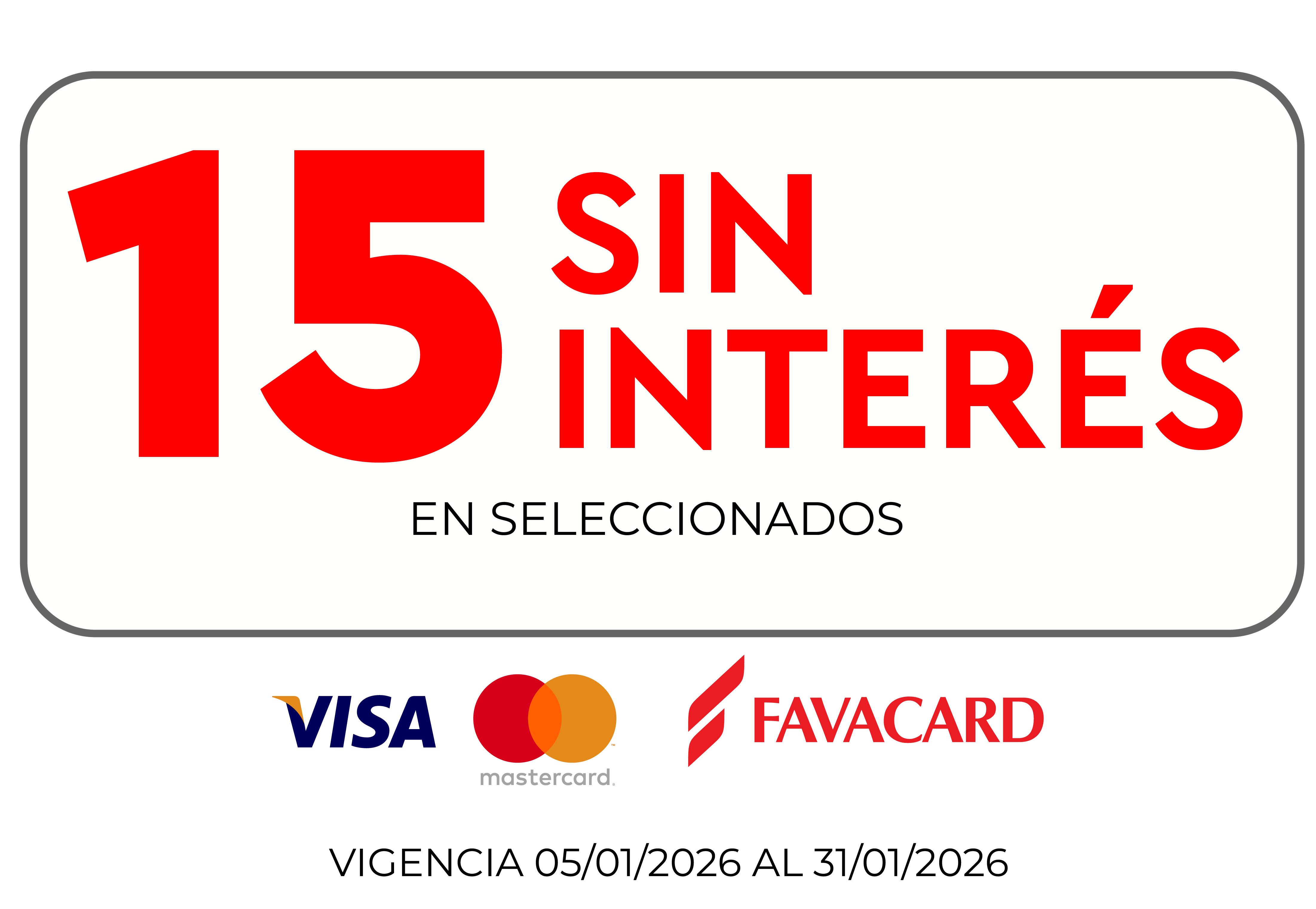Promoción 15 cuotas sin interés: 15 cuotas sin interés en artículos seleccionados abonando con tarjeta Favacard, Visa o Mastercard bancarizadas. Vigente desde el 05/01/2026 al 31/01/2026 o hasta agotar stock de 5 un. Promoción sin tope de reintegro. El descuento se aplica sobre el precio de lista. Válido para compras efectuadas en sucursales, venta telefónica y venta web. CFTNA 0,00% (Costo Financiero Total Nominal Anual). CFT 0,00% (Costo Financiero Total). TNA 0,00% (Tasa Nominal Anual). TEA 0,00% (Tasa Efectiva Anual). Fava Hnos Sacif, Cuit 30-50085237-9 - Casa Central: Av.Luro 3247, Mar del Plata Provincia de Buenos Aires- Argentina.