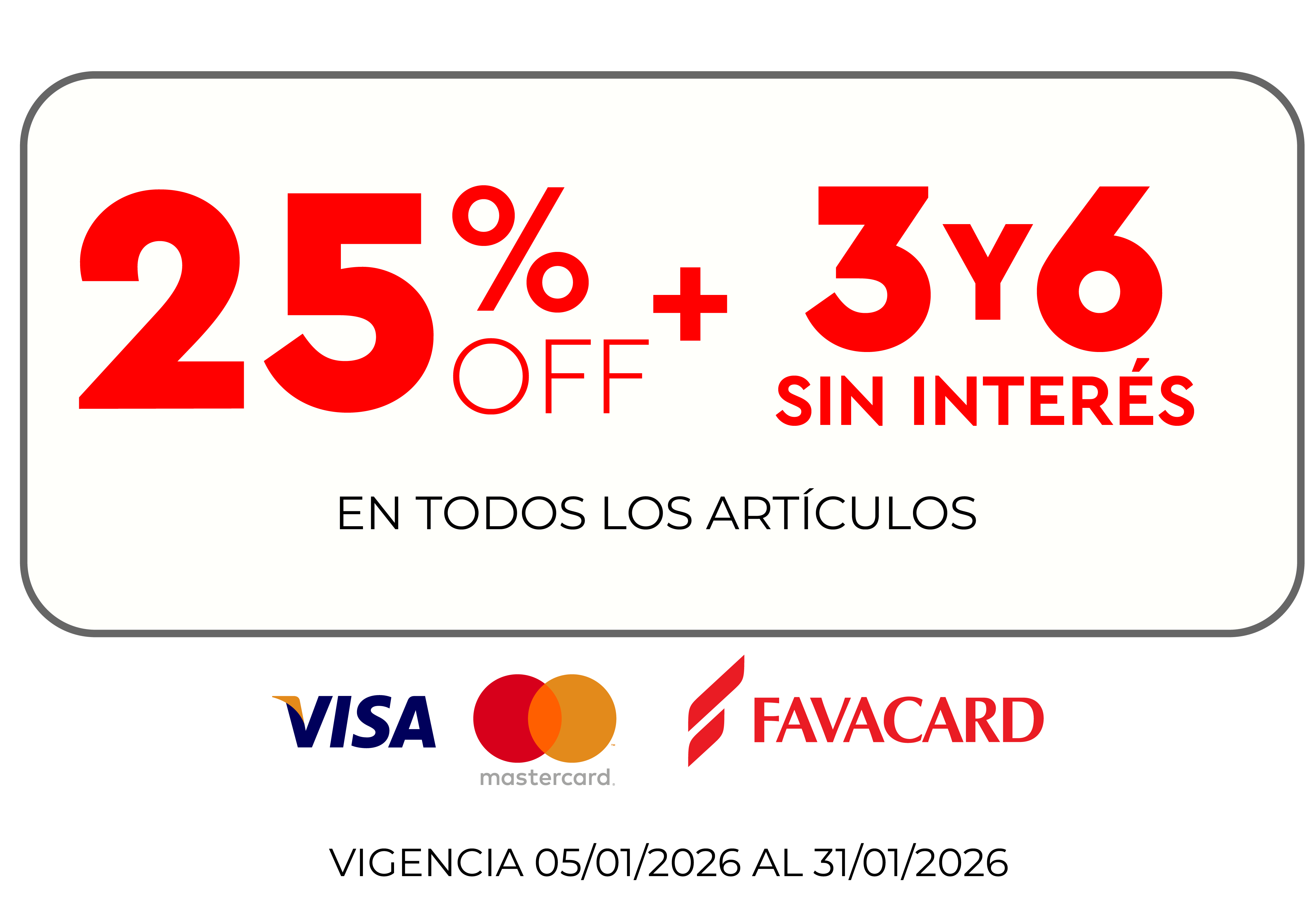 Promoción 25% off + 6 sin interés: 25% de descuento más 6 cuotas sin interés en todos los artículos abonando con tarjeta Favacard, Visa o Mastercard bancarizadas. Vigente desde el 05/01/2026 al 31/01/2026 o hasta agotar stock de 5 un. Promoción sin tope de reintegro. El descuento se aplica sobre el precio de lista. Válido para compras efectuadas en sucursales, venta telefónica y venta web. CFTNA 0,00% (Costo Financiero Total Nominal Anual). CFT 0,00% (Costo Financiero Total). TNA 0,00% (Tasa Nominal Anual). TEA 0,00% (Tasa Efectiva Anual). Fava Hnos Sacif, Cuit 30-50085237-9 - Casa Central: Av.Luro 3247, Mar del Plata Provincia de Buenos Aires- Argentina.