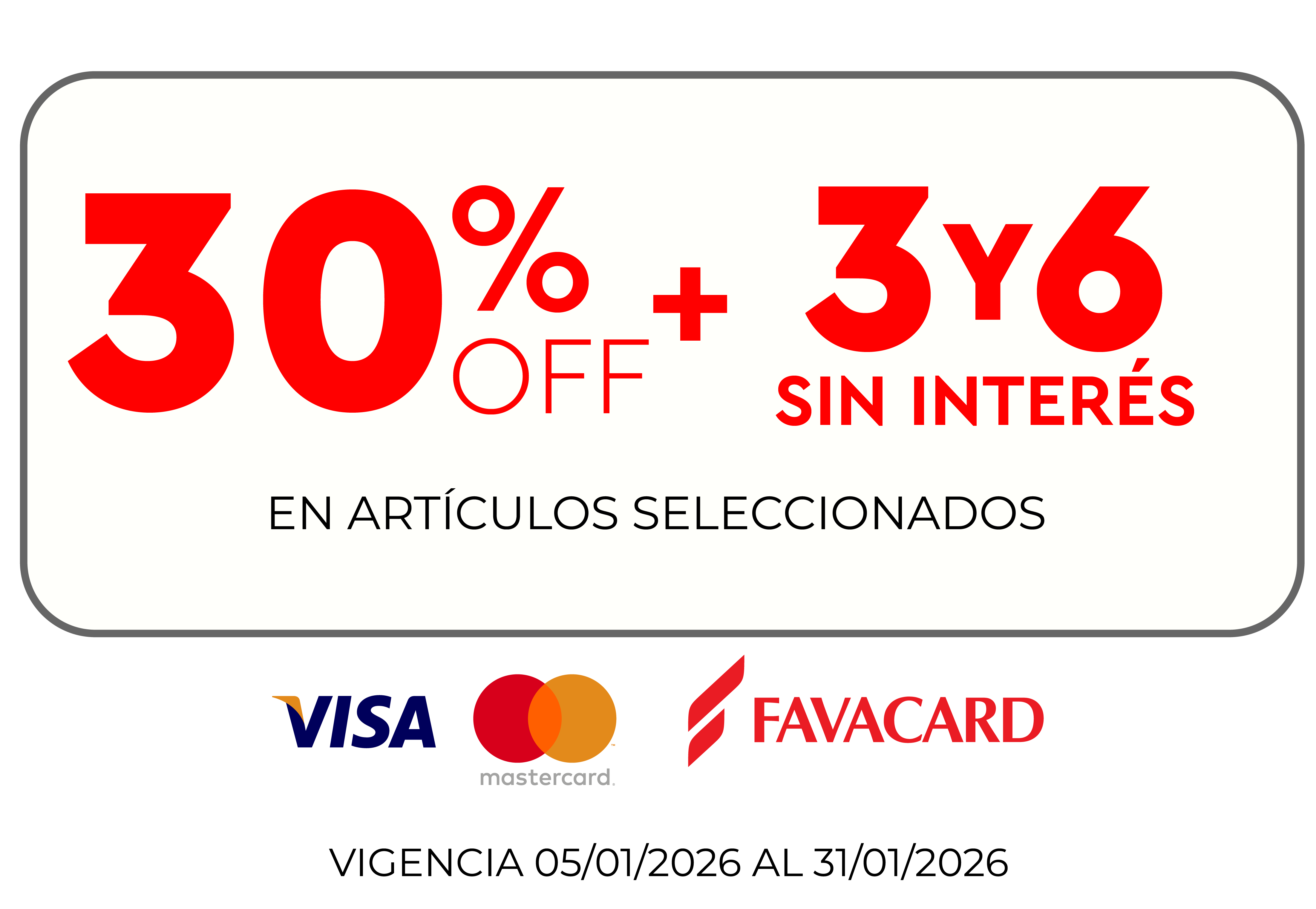 Promoción 30% off + 6 sin interés: 30% de descuento más 6 cuotas sin interés en artículos seleccionados abonando con tarjeta Favacard, Visa o Mastercard bancarizadas Vigente desde el 05/01/2026 al 31/01/2026 o hasta agotar stock de 5 un. Promoción sin tope de reintegro. El descuento se aplica sobre el precio de lista. Válido para compras efectuadas en sucursales, venta telefónica y venta web. CFTNA 0,00% (Costo Financiero Total Nominal Anual). CFT 0,00% (Costo Financiero Total). TNA 0,00% (Tasa Nominal Anual). TEA 0,00% (Tasa Efectiva Anual). Fava Hnos Sacif, Cuit 30-50085237-9 - Casa Central: Av.Luro 3247, Mar del Plata Provincia de Buenos Aires- Argentina.