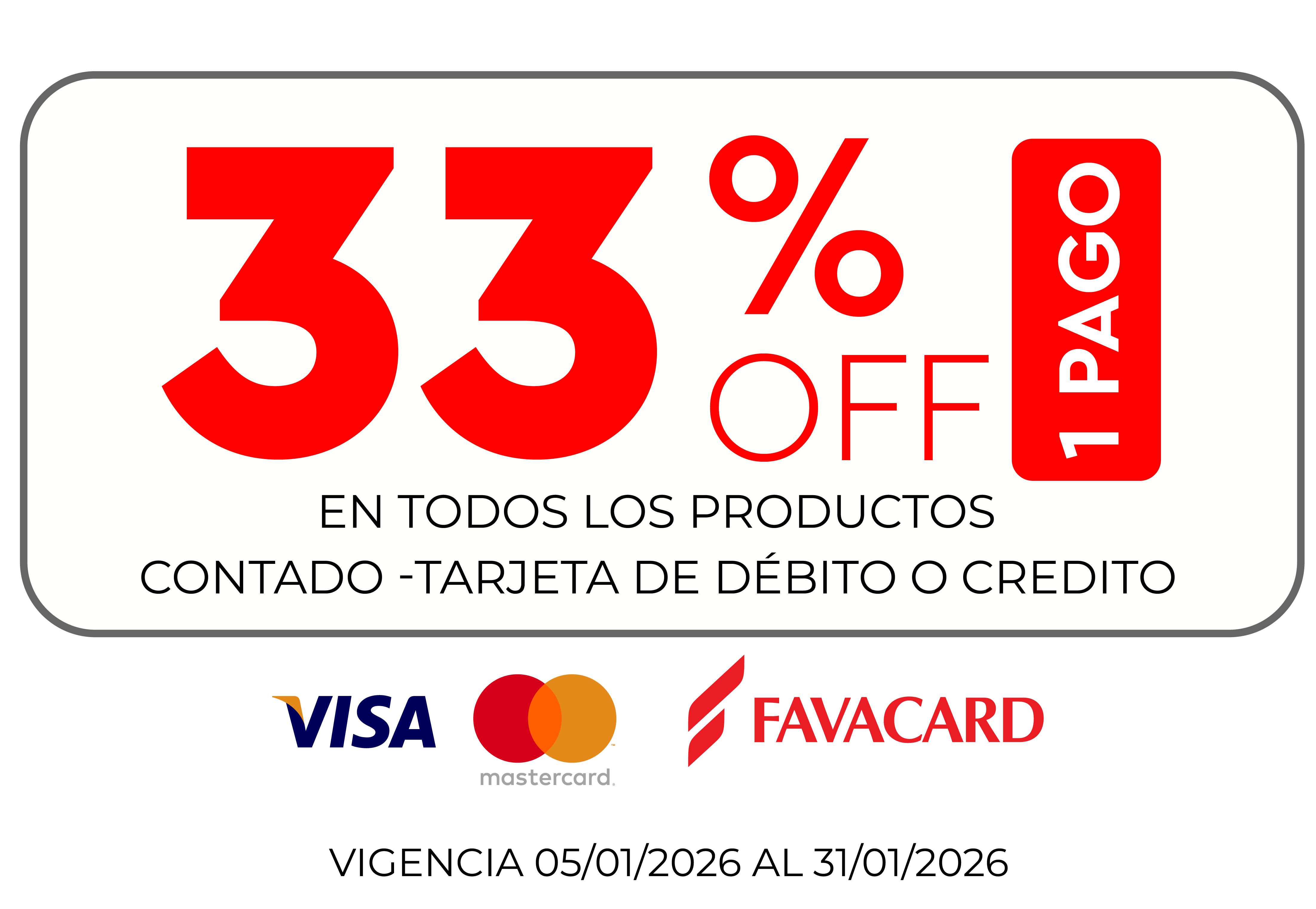 Promoción 33% off 1 pago: 33% de descuento en 1 pago en todos los artículos abonando con tarjeta Favacard, Visa o Mastercard bancarizadas. Vigente desde el 05/01/2026 al 31/01/2026 o hasta agotar stock de 5 un. Promoción sin tope de reintegro. El descuento se aplica sobre el precio de lista. Válido para compras efectuadas en sucursales, venta telefónica y venta web. CFTNA 0,00% (Costo Financiero Total Nominal Anual). CFT 0,00% (Costo Financiero Total). TNA 0,00% (Tasa Nominal Anual). TEA 0,00% (Tasa Efectiva Anual). Fava Hnos Sacif, Cuit 30-50085237-9 - Casa Central: Av.Luro 3247, Mar del Plata Provincia de Buenos Aires- Argentina.