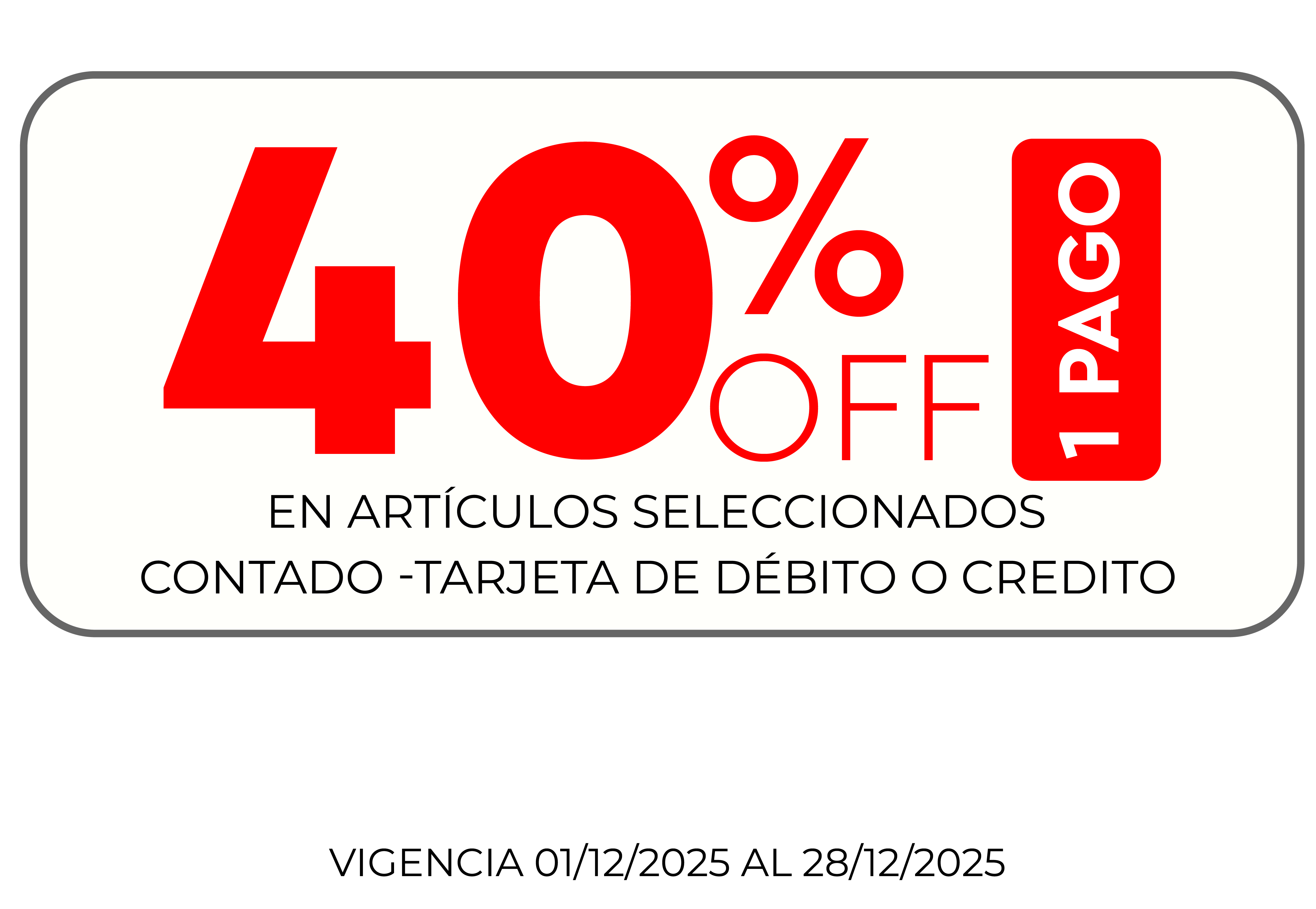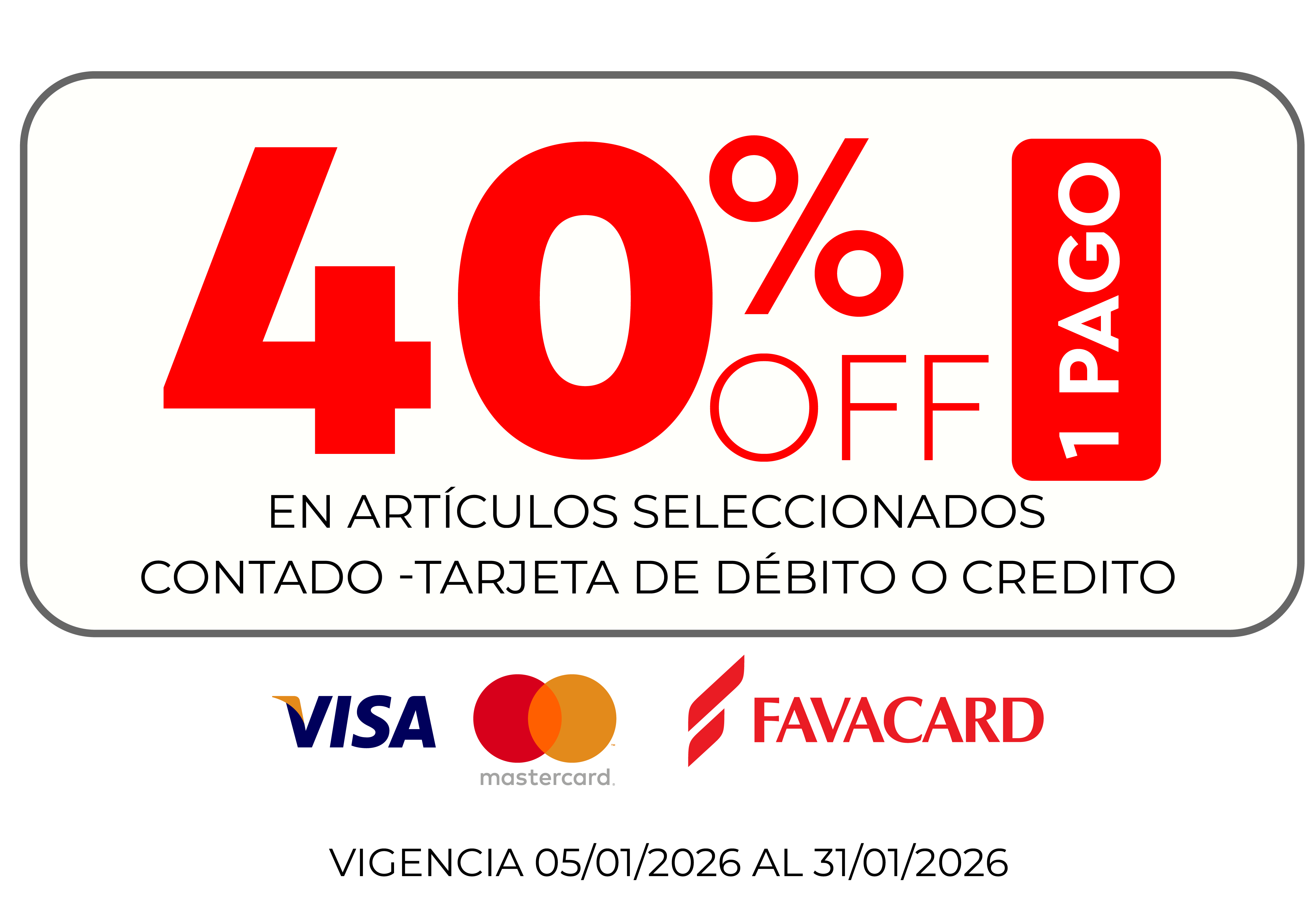 Promoción 40% off 1 pago: 40% de descuento en 1 pago en artículos seleccionados abonando con tarjeta Favacard, Visa o Mastercard bancarizadas. Vigente desde el 05/01/2026 al 31/01/2026 o hasta agotar stock de 5 un. Promoción sin tope de reintegro. El descuento se aplica sobre el precio de lista. Válido para compras efectuadas en sucursales, venta telefónica y venta web. CFTNA 0,00% (Costo Financiero Total Nominal Anual). CFT 0,00% (Costo Financiero Total). TNA 0,00% (Tasa Nominal Anual). TEA 0,00% (Tasa Efectiva Anual). Fava Hnos Sacif, Cuit 30-50085237-9 - Casa Central: Av.Luro 3247, Mar del Plata Provincia de Buenos Aires- Argentina.