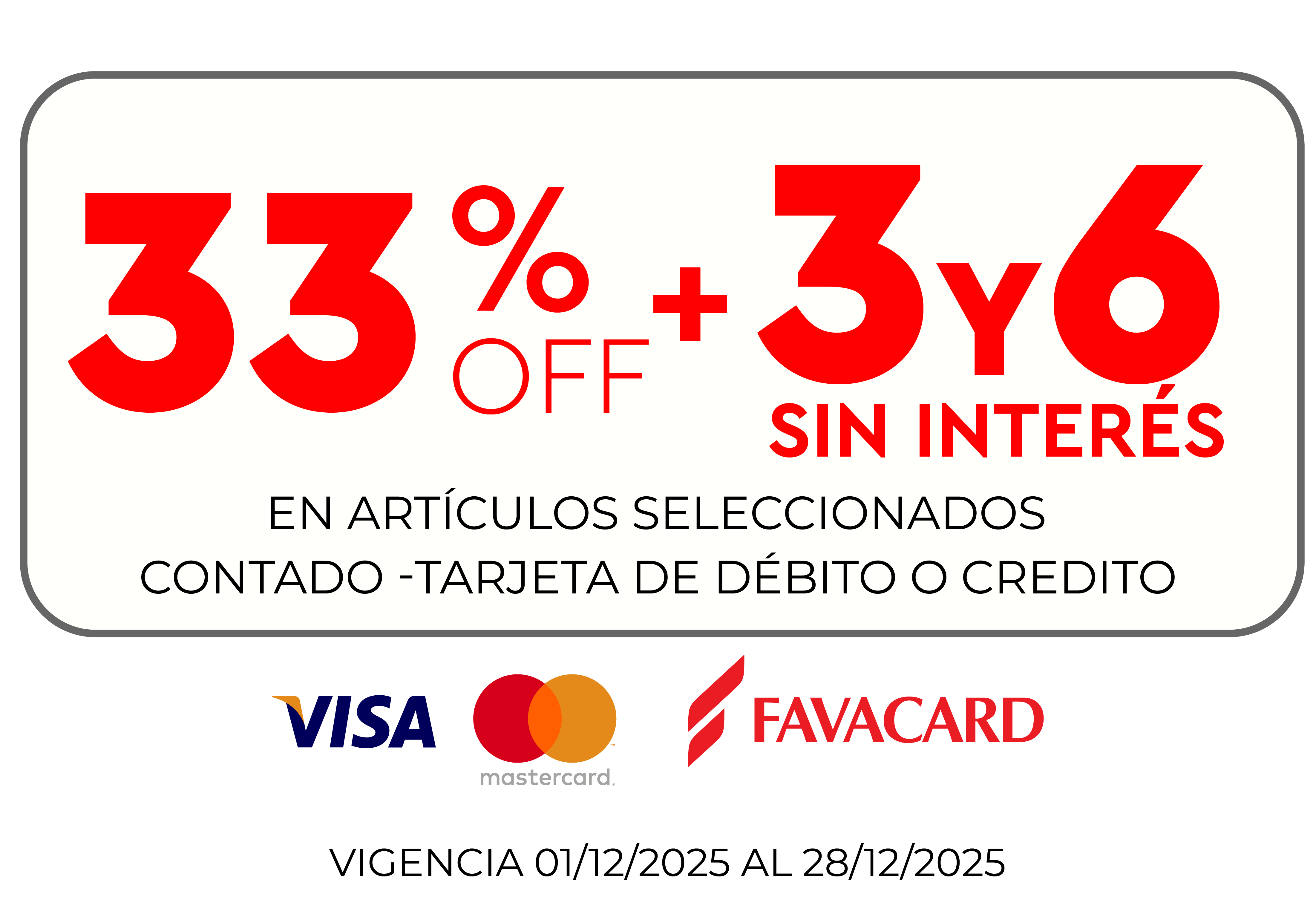 Promoción 33% off + 6 sin interés: 33% de descuento más 6 cuotas sin interés en artículos seleccionados abonando con tarjeta Favacard, Visa o Mastercard bancarizadas. Vigente desde el 05/01/2026 al 31/01/2026 o hasta agotar stock de 5 un. Promoción sin tope de reintegro. El descuento se aplica sobre el precio de lista. Válido para compras efectuadas en sucursales, venta telefónica y venta web. CFTNA 0,00% (Costo Financiero Total Nominal Anual). CFT 0,00% (Costo Financiero Total). TNA 0,00% (Tasa Nominal Anual). TEA 0,00% (Tasa Efectiva Anual). Fava Hnos Sacif, Cuit 30-50085237-9 - Casa Central: Av.Luro 3247, Mar del Plata Provincia de Buenos Aires- Argentina.