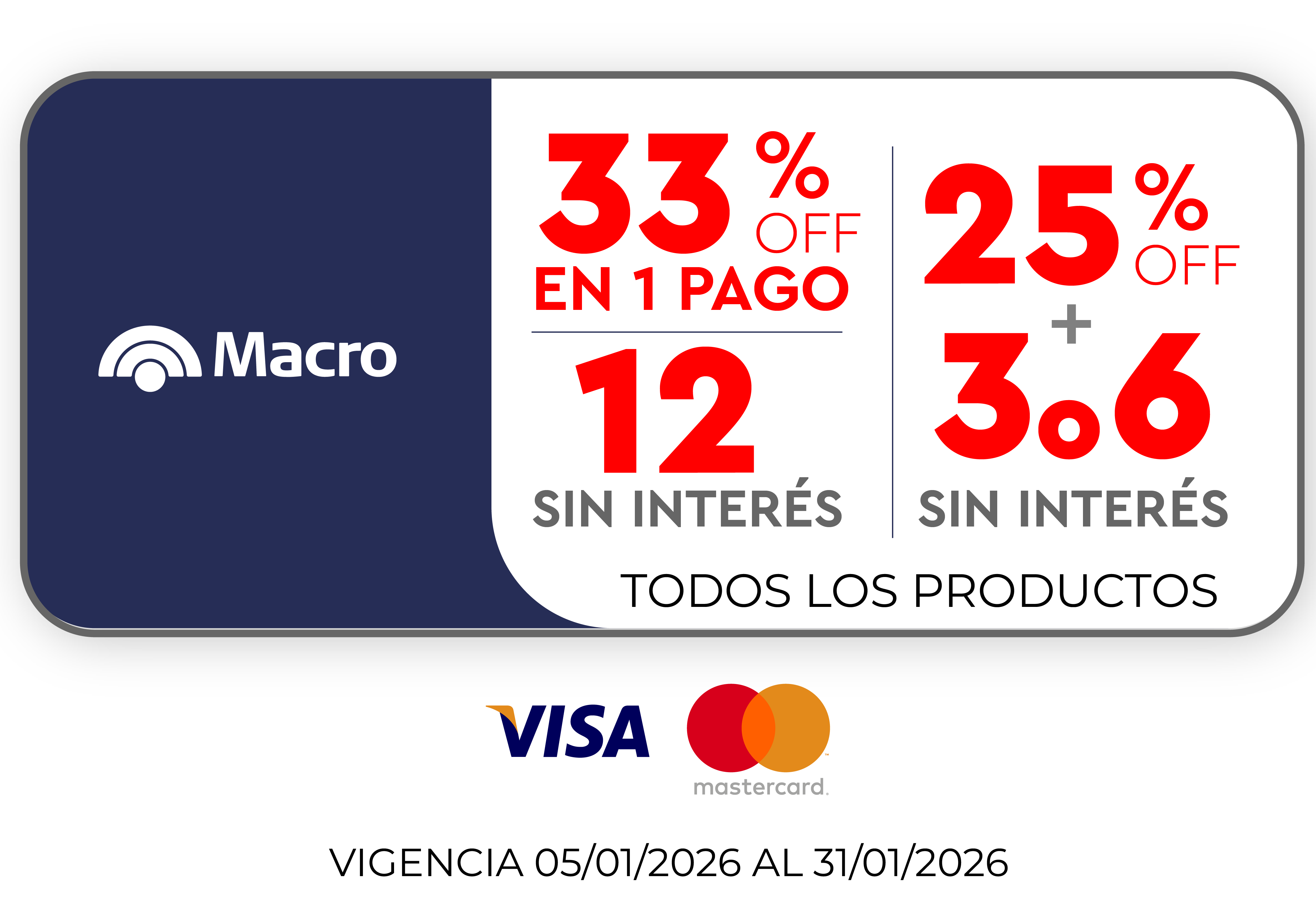 Promoción Banco MACRO: 33% de descuento en un pago, o, 25% de descuento más 3 o 6 cuotas sin interés, o, 12 cuotas sin interés. Vigencia del 05/01/2026 al 31/01/2026 o hasta agotar stock de 5 un. El descuento se aplica sobre el precio de lista. Promoción válida todos los días abonando con tarjetas Visa y Mastercard del Banco Macro. CFT 0,00% (Costo Financiero Total). TNA 0,00% (Tasa Nominal Anual). TEA 0,00% (Tasa Efectiva Anual). Fava Hnos Sacif, Cuit 30-50085237-9 - Casa Central: Av.Luro 3247, Mar del Plata Provincia de Buenos Aires- Argentina.