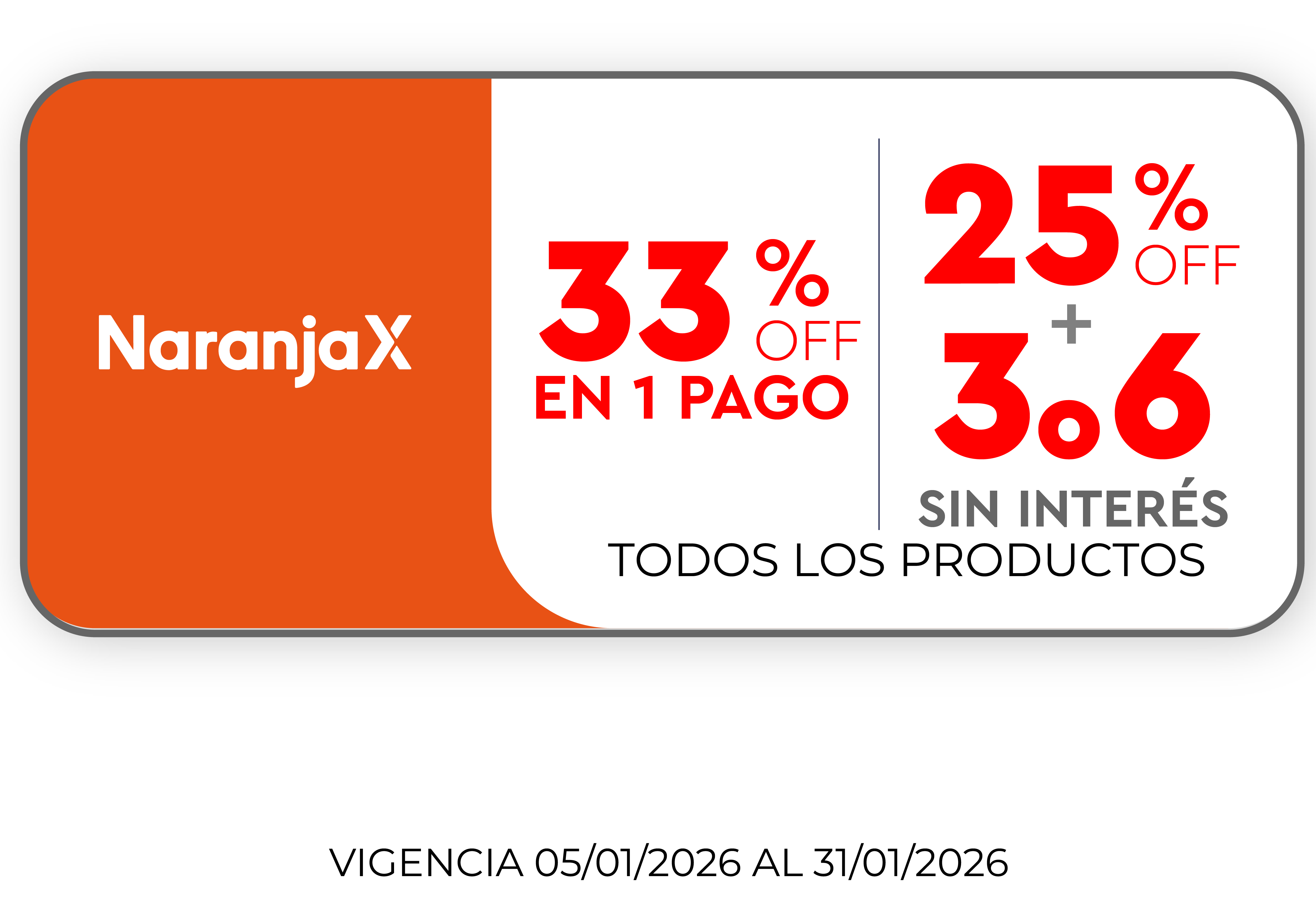 Promoción Tarjeta NARANJA: 33% de descuento en un pago, o, 25% de descuento más 3 o 6 cuotas sin interés. Vigencia del 05/01/2026 al 31/01/2026 o hasta agotar stock de 5 un. El descuento se aplica sobre el precio de lista. Promoción válida todos los días abonando con tarjeta NARANJA. CFT 0,00% (Costo Financiero Total). TNA 0,00% (Tasa Nominal Anual). TEA 0,00% (Tasa Efectiva Anual). Fava Hnos Sacif, Cuit 30-50085237-9 - Casa Central: Av.Luro 3247, Mar del Plata Provincia de Buenos Aires- Argentina.