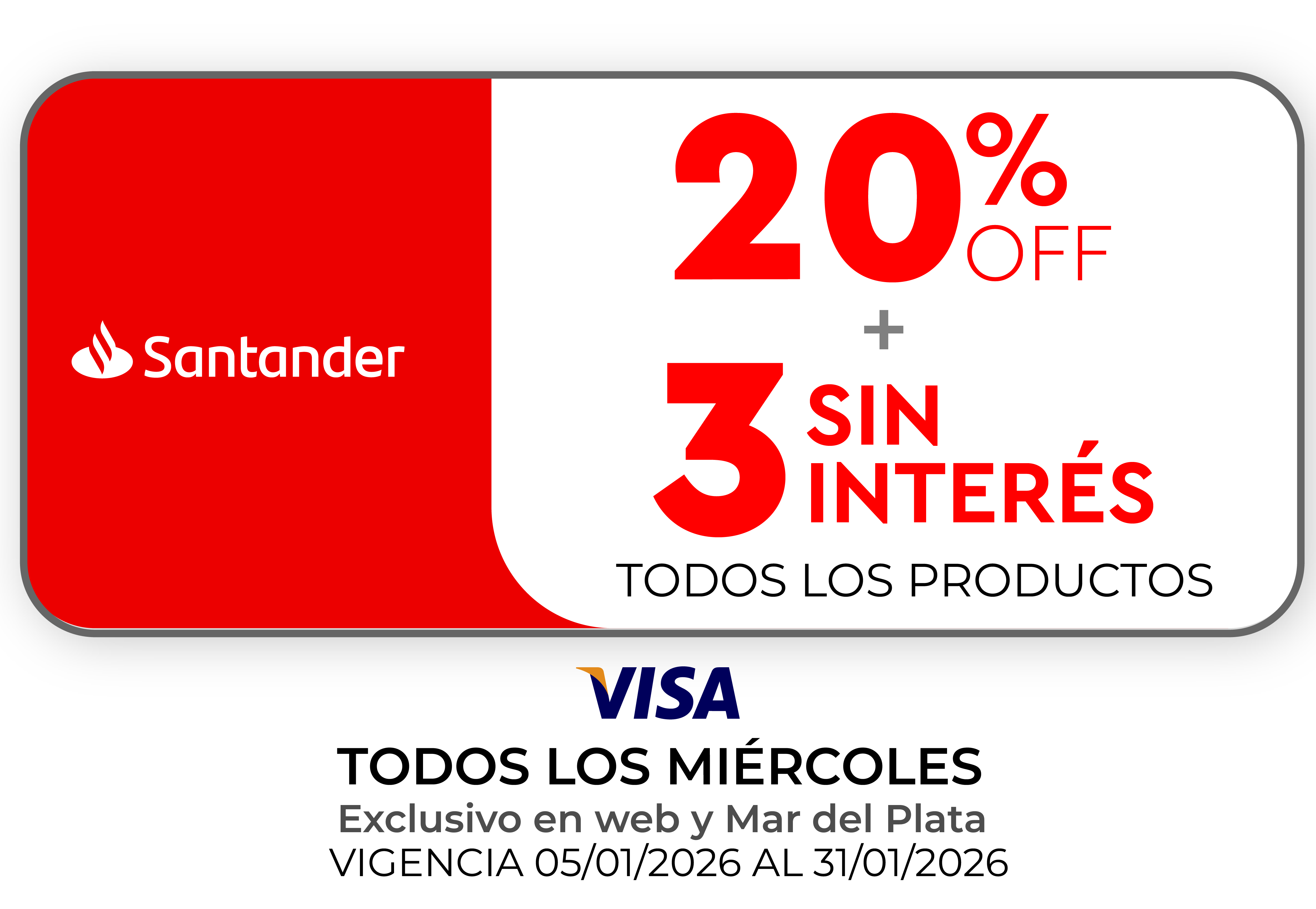 Promoción Banco SANTANDER: 20% de descuento más 3 cuotas sin interés en todos los productos o hasta agotar stock de 5 un. Promoción válida los días MIÉRCOLES abonando con tarjeta Visa de Banco Santander. Vigencia del 05/01/2026 al 31/01/2026. El descuento se aplica sobre el precio de lista. Exclusivo para compras realizadas de manera presencial en sucursales de la localidad de Mar del Plata (Casa Central - Suc. Puerto y Suc. El Gaucho, o, a través de la web www.fava.com.ar). CFT 0,00% (Costo Financiero Total). TNA 0,00% (Tasa Nominal Anual). TEA 0,00% (Tasa Efectiva Anual). Fava Hnos Sacif, Cuit 30-50085237-9 - Casa Central: Av. Luro 3247, Mar del Plata Provincia de Buenos Aires- Argentina.